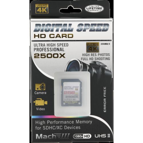 Capture Full HD, 3D, and 4K content with the Digital Speed 2500X 256GB Professional High Speed Mach III 350MB/s Error Free (SDHC) HD Memory Card Class 10 Memory Card. Each of the included SDXC memory card meets the UHS Speed Class 10 specification with maximum data speed of 350 MB/s. While this card is designed to meet the needs of those requiring enhanced data transfer rates, it remains backwards compatible with devices requiring UHS-II, Class 10 memory cards.