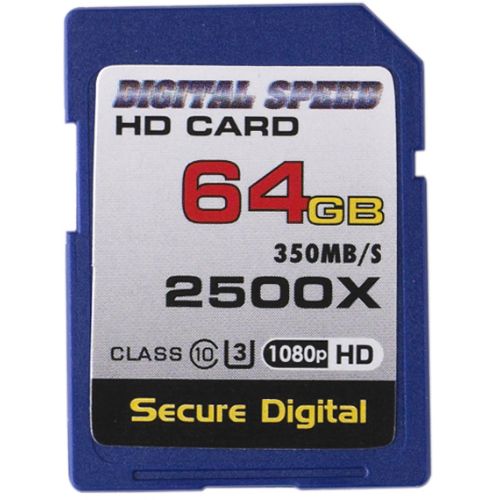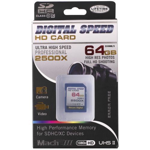 Capture Full HD, 3D, and 4K content with the Digital Speed 2500X 64GB Professional High Speed Mach III 350MB/s Error Free (SDHC) HD Memory Card Class 10 Memory Card. Each of the included SDXC memory card meets the UHS Speed Class 10 specification with maximum data speed of 350 MB/s. While this card is designed to meet the needs of those requiring enhanced data transfer rates, it remains backwards compatible with devices requiring UHS-II, Class 10 memory cards.