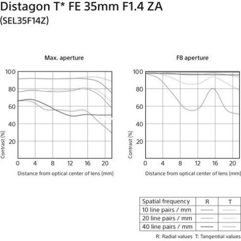 Sony 35mm F/1.4 Overview Fast, sharp, and loaded with the latest technology, the Distagon T* FE 35mm f/1.4 ZA Lens from Sony offers full-frame E-mount shooters a classic wide-angle focal length with excellent optical performance. Offering a maximum aperture of f/1.4, shooters will enjoy excellent performance in low-light conditions as well as the ability to create images with a shallow depth of field. Ensuring excellent imagery are three aspherical elements and one Advanced Aspherical (AA) element which combat aberrations. Along with this, the lens uses a Zeiss T* anti-reflective coating to effectively eliminate flare and ghosting to create a sharp, contrasty image. Photographers and videographers will enjoy fast, responsive focusing due to the implementation of a direct drive Super Sonic wave AF Motor (SSM) and an internal focusing mechanism. There are tactile control options as well, including an AF/MF switch and a physical aperture ring, which can be de-clicked for smooth iris